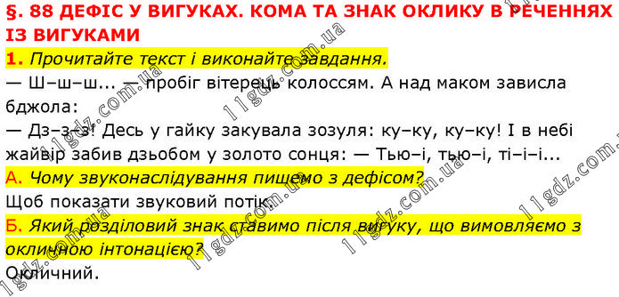 §. 88 ДЕФІС У ВИГУКАХ. КОМА ТА ЗНАК ОКЛИКУ В РЕЧЕННЯХ ІЗ ВИГУКАМИ 1. Прочитайте текст і виконайте завдання. — Ш–ш–ш... — пробіг вітерець колоссям. А над маком зависла бджола: — Дз–з–з! Десь у гайку закувала зозуля: ку–ку, ку–ку! І в небі жайвір забив дзьобом у золото сонця: — Тью–і, тью–і, ті–і–і... А. Чому звуконаслідування пишемо з дефісом? Щоб показати звуковий потік. Б. Який розділовий знак ставимо після вигуку, що вимовляємо з окличною інтонацією? Окличний.