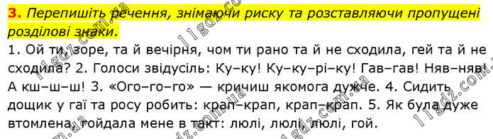 Перепишіть речення, знімаючи риску та розставляючи пропущені розділові знаки. 1. Ой ти, зоре, та й вечірня, чом ти рано та й не сходила, гей та й не сходила? 2. Голоси звідусіль: Ку–ку! Ку–ку–рі–ку! Гав–гав! Няв–няв! А кш–ш–ш! 3. «Ого–го–го» — кричиш якомога дужче. 4. Сидить дощик у гаї та росу робить: крап–крап, крап–крап. 5. Як була дуже втомлена, гойдала мене в такт: люлі, люлі, люлі, гой.