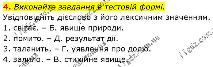Виконайте завдання в тестовій формі. Увідповідніть дієслово з його лексичним значенням. 1. світає. – Б. явище природи. 2. помито. – Д. результат дії. 3. таланить. – Г. уявлення про долю. 4. залило. – В. стихійне явище.