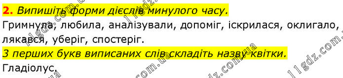 Випишіть форми дієслів минулого часу. Гримнула, любила, аналізували, допоміг, іскрилася, оклигало, лякався, уберіг, спостеріг. 3 перших букв виписаних слів складіть назву квітки. Гладіолус.
