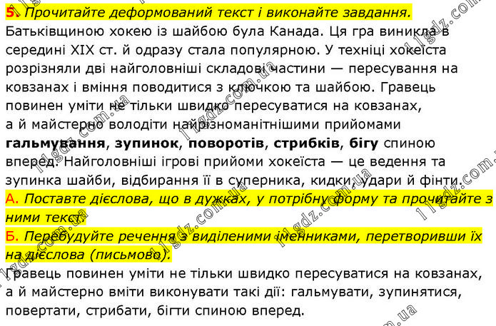 Прочитайте деформований текст і виконайте завдання. Батьківщиною хокею із шайбою була Канада. Ця гра виникла в середині XIX ст. й одразу стала популярною. У техніці хокеїста розрізняли дві найголовніші складові частини — пересування на ковзанах і вміння поводитися з ключкою та шайбою. Гравець повинен уміти не тільки швидко пересуватися на ковзанах, а й майстерно володіти найрізноманітнішими прийомами гальмування, зупинок, поворотів, стрибків, бігу спиною вперед. Найголовніші ігрові прийоми хокеїста — це ведення та зупинка шайби, відбирання її в суперника, кидки, удари й фінти. А. Поставте дієслова, що в дужках, у потрібну форму та прочитайте з ними текст. Б. Перебудуйте речення з виділеними іменниками, перетворивши їх на дієслова (письмово). Гравець повинен уміти не тільки швидко пересуватися на ковзанах, а й майстерно вміти виконувати такі дії: гальмувати, зупинятися, повертати, стрибати, бігти спиною вперед.