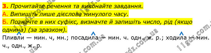 Прочитайте речення та виконайте завдання. А. Випишіть лише дієслова минулого часу. Б. Позначте в них суфікс, визначте й запишіть число, рід (якщо однина) (за зразком). Пливли — мин. ч, мн.; посадила — мин. ч. одн., ж. р.; ходила — мин. ч., одн., ж. р.
