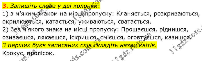 Запишіть слова у дві колонки: 1) з м’яким знаком на місці пропуску: Кланяється, розкриваються, окрилюються, катається, уживаються, сватається. 2) без м’якого знака на місці пропуску: Прощаєшся, ріднишся, озиваєшся, лякаєшся, іскришся, смієшся, оговтуєшся, казишся. 3 перших букв записаних слів складіть назви квітів. Крокус, пролісок.