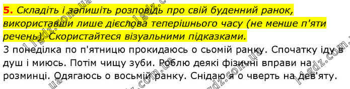 Складіть і запишіть розповідь про свій буденний ранок, використавши лише дієслова теперішнього часу (не менше п'яти речень). Скористайтеся візуальними підказками. 3 понеділка по п'ятницю прокидаюсь о сьомій ранку. Спочатку іду в душ і миюсь. Потім чищу зуби. Роблю деякі фізичні вправи на розминці. Одягаюсь о восьмій ранку. Снідаю я о чверть на дев'яту.