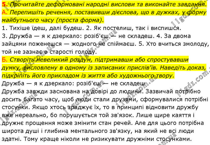 Прочитайте деформовані народні вислови та виконайте завдання. А. Перепишіть речення, поставивши дієслова, що в дужках, у форму майбутнього часу (проста форма). 1. Тихіше їдеш, далі будеш. 2. Як постелиш, так і виспишся. 3. Дружба — я к дзеркало: розіб'єш — не складеш. 4. За двома зайцями поженешся — жодного не спіймаєш. 5. Хто вчиться змолоду, той не зазнає в старості голоду. Б. Створіть невеликий роздум, підтримавши або спростувавши думку, висловлену в одному із записаних прислів'їв. Наведіть доказ, підкріпіть його прикладом із життя або художнього твору. Дружба — я к дзеркало: розіб'єш — не складеш Дружба завжди заснована на довірі до людини. Зазвичай потрібно досить багато часу, щоб люди стали друзями, сформувалися потрібні стосунки. Якщо хтось зраджує їх, то в принципі відновити дружбу вже нереально, бо порушується той зв'язок. Лише щире каяття і дружнє прощення може змінити стан речей. Але для цього потрібна широта душі і глибина ментального зв'язку, на який не всі люди здатні. Тому краще ніколи не ризикувати дружніми стосунками.