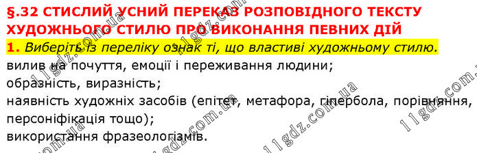 Виберіть із переліку ознак ті, що властиві художньому стилю. вилив на почуття, емоції і переживання людини; образність, виразність; наявність художніх засобів (епітет, метафора, гіпербола, порівняння, персоніфікація тощо); використання фразеологізмів.