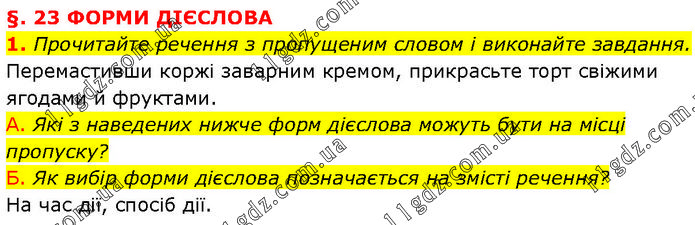 §. 23 ФОРМИ ДІЄСЛОВА 1. Прочитайте речення з пропущеним словом і виконайте завдання. Перемастивши коржі заварним кремом, прикрасьте торт свіжими ягодами й фруктами. А. Які з наведених нижче форм дієслова можуть бути на місці пропуску? Б. Як вибір форми дієслова позначається на змісті речення? На час дії, спосіб дії.