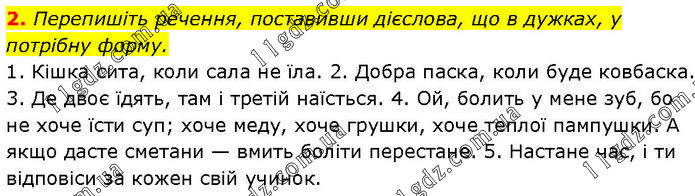 Перепишіть речення, поставивши дієслова, що в дужках, у потрібну форму. 1. Кішка сита, коли сала не їла. 2. Добра паска, коли буде ковбаска. 3. Де двоє їдять, там і третій наїсться. 4. Ой, болить у мене зуб, бо не хоче їсти суп; хоче меду, хоче грушки, хоче теплої пампушки. А якщо дасте сметани — вмить боліти перестане. 5. Настане час, і ти відповіси за кожен свій учинок.