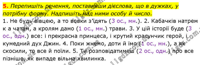 Перепишіть речення, поставивши дієслова, що в дужках, у потрібну форму. Надпишіть над ними особу й число. 1. Не будь вівцею, а то вовки з’їдять (3 ос., мн.). 2. Кабачків натрем к а чатам, а кролям дамо (1 ос., мн.) трави. 3. У цій історії буде (3 ос., одн.) все: і прекрасна принцеса, і крутий красунчик герой, і кумедний дух Джин. 4. Поки жнемо, доти й їмо (1 ос., мн.), а як скосили, то все й поїли. 5. Ти розповідатимеш (2 ос., одн.) про все пізніше, як випаде вільна хвилинка.