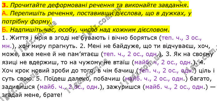 Прочитайте деформовані речення та виконайте завдання. А. Перепишіть речення, поставивши дієслова, що в дужках, у потрібну форму. Б. Надпишіть час, особу, число над кожним дієсловом. 1. Життя і мрія в згоді не бувають і вічно боряться (теп. ч., 3 ос., мн.), хоч миру прагнуть. 2. Мені не байдуже, що ти відчуваєш, хоч, може, вже мене й не пам’ятаєш (теп. ч., 2 ос., одн.). 3. Як на своєму язиці не вдержиш, то на чужому не втаїш (майб. ч, 2 ос., одн.). 4. Хоч крок новий зроби до того, в чім бачиш (теп. ч., 2 ос., одн.) ціль і суть свою. 5. Поїдеш далеко, побачиш (майб. ч., 2 ос., одн.) багато, задивишся (майб. ч., 2 ос., одн.), зажуришся (майб. ч., 2 ос., одн.) — згадай мене, брате!