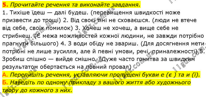 Прочитайте речення та виконайте завдання. 1. Тихіше їдеш — далі будеш. (перевищення швидкості може призвести до трощі) 2. Від своєї тіні не сховаєшся. (люди не втече від себе, своїх помилок) 3. Хочеш не хочеш, а вище себе не стрибнеш. (Є межа можливостей кожної людини, не завжди потрібно прагнути більшого) 4. З води обіду не звариш. (Для досягнення мети потрібні не лише зусилля, але й певні умови, речі, приналежності) 5. Зробиш спішно — вийде смішно. (Дуже часто гонитва за швидким результатом обертається на повний провал) А. Перепишіть речення, уставляючи пропущені букви е (є ) та и (ї). Б. Наведіть по одному прикладу з вашого життя або художнього твору до кожного з них.