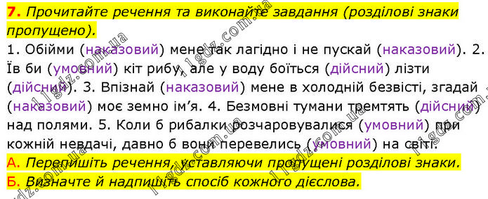 Прочитайте речення та виконайте завдання (розділові знаки пропущено). 1. Обійми (наказовий) мене так лагідно і не пускай (наказовий). 2. Їв би (умовний) кіт рибу, але у воду боїться (дійсний) лізти (дійсний). 3. Впізнай (наказовий) мене в холодній безвісті, згадай (наказовий) моє земно ім’я. 4. Безмовні тумани тремтять (дійсний) над полями. 5. Коли б рибалки розчаровувалися (умовний) при кожній невдачі, давно б вони перевелись (умовний) на світі. А. Перепишіть речення, уставляючи пропущені розділові знаки. Б. Визначте й надпишіть спосіб кожного дієслова.