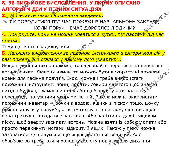 Прочитайте текст і виконайте завдання. ЯК ПОВОДИТИСЯ ПІД ЧАС ПОЖЕЖІ В НАВЧАЛЬНОМУ ЗАКЛАДІ, КОЛИ ПОРУЧ НЕМАЄ ДОРОСЛОЇ ЛЮДИНИ? А. Поміркуйте, чому не можна ховатися в кутки, під партами під час пожежі. Тому що можна задихнутися. Б. Напишіть висловлення за поданою інструкцією з алгоритмом дій у разі пожежі, що сталася у вашому домі (квартирі). Якщо в домі виникла пожежа, то слід знайти переносні та перевізні вогнегасники. Якщо їх немає, то можуть бути використані пожежні крани для гасіння полум'я. Іноді можна і треба використати пожежний інструмент: ломи, лопати, сокири для того щоб знайти вихід з будівлі, зламавши стіну або щоб зруйнувати палаючу перешкоду потужними ударами по ній. Також можна використати пожежний інвентар — бочки з водою, ящики з піском тощо. Бочку можна кинути у полум'я, а потім метнути в неї лом, як спис, щоб вона тріснула, а вода все загасила. Або залізти на дах із ящиком піску, щоб зверху засипати вогонь. Можна взяти із собою лопати або просто перекинути ногами відкритий ящик. Також у піску можна заховатися від полум'я якщо ящик достатньо великий. Але обов'язково треба взяти холодну вологу пов'язку для дихання.