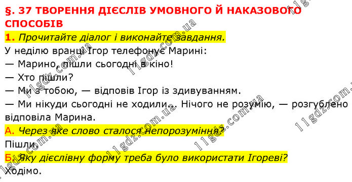 Прочитайте діалог і виконайте завдання. У неділю вранці Ігор телефонує Марині: — Марино, пішли сьогодні в кіно! — Хто пішли? — Ми з тобою, — відповів Ігор із здивуванням. — Ми нікуди сьогодні не ходили... Нічого не розумію, — розгублено відповіла Марина. А. Через яке слово сталося непорозуміння? Пішли. Б. Яку дієслівну форму треба було використати Ігореві? Ходімо.