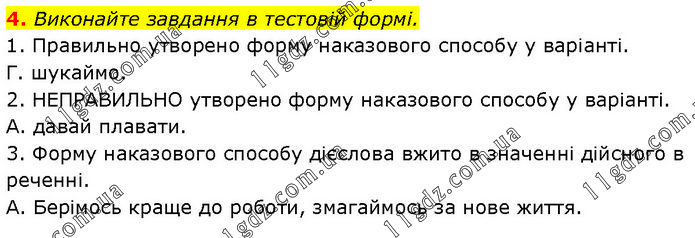 Виконайте завдання в тестовій формі. 1. Правильно утворено форму наказового способу у варіанті. Г. шукаймо. 2. НЕПРАВИЛЬНО утворено форму наказового способу у варіанті. А. давай плавати. 3. Форму наказового способу дієслова вжито в значенні дійсного в реченні. А. Берімось краще до роботи, змагаймось за нове життя.