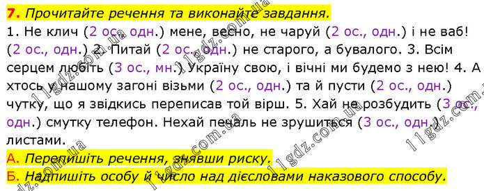Прочитайте речення та виконайте завдання. 1. Не клич (2 ос., одн.) мене, весно, не чаруй (2 ос., одн.) і не ваб! (2 ос., одн.) 2. Питай (2 ос., одн.) не старого, а бувалого. 3. Всім серцем любіть (3 ос., мн.) Україну свою, і вічні ми будемо з нею! 4. А хтось у нашому загоні візьми (2 ос., одн.) та й пусти (2 ос., одн.) чутку, що я звідкись переписав той вірш. 5. Хай не розбудить (3 ос., одн.) смутку телефон. Нехай печаль не зрушиться (3 ос., одн.) листами. А. Перепишіть речення, знявши риску. Б. Надпишіть особу й число над дієсловами наказового способу.