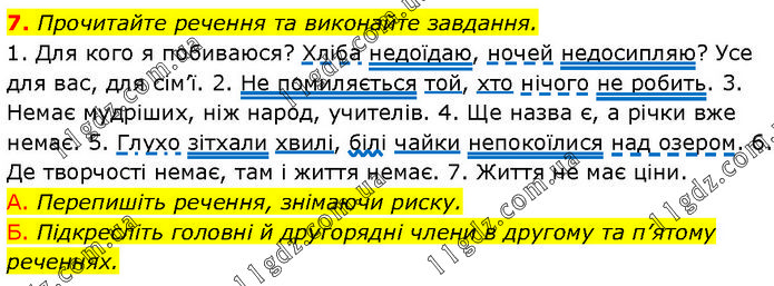 Прочитайте речення та виконайте завдання. 1. Для кого я побиваюся? Хліба недоїдаю, ночей недосипляю? Усе для вас, для сім’ї. 2. Не помиляється той, хто нічого не робить. 3. Немає мудріших, ніж народ, учителів. 4. Ще назва є, а річки вже немає. 5. Глухо зітхали хвилі, білі чайки непокоїлися над озером. 6. Де творчості немає, там і життя немає. 7. Життя не має ціни. А. Перепишіть речення, знімаючи риску. Б. Підкресліть головні й другорядні члени в другому та п’ятому реченнях.