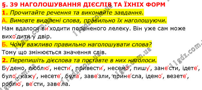 1. Прочитайте речення та виконайте завдання. А. Вимовте виділені слова, правильно їх наголошуючи. Нам вдалося ви՛ходити пораненого лелеку. Він уже сам може вихо՛дити у двір. Б. Чому важливо правильно наголошувати слова? Тому що змінюється значення слів. 2. Перепишіть дієслова та поставте в них наголоси. Бу՛демо, люблю՛, нести՛, привести՛, несемо՛, пишу՛, зане՛сти, ідете՛, було՛, кажу՛, несете՛, була՛, заве՛зли, прине՛сла, ідемо՛, везете՛, роблю՛, ве՛сти, заве՛ла.