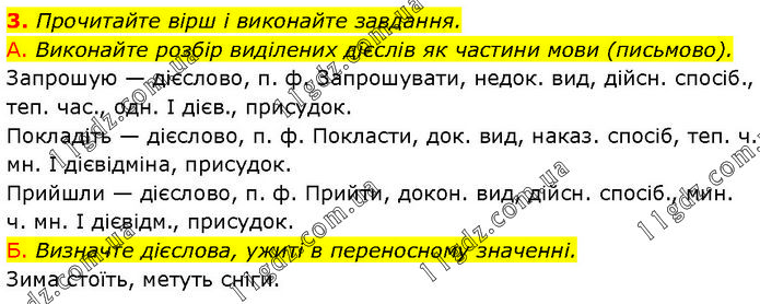 Прочитайте вірш і виконайте завдання. А. Виконайте розбір виділених дієслів як частини мови (письмово). Запрошую — дієслово, п. ф. Запрошувати, недок. вид, дійсн. спосіб., теп. час., одн. І дієв., присудок. Покладіть — дієслово, п. ф. Покласти, док. вид, наказ. спосіб, теп. ч. мн. І дієвідміна, присудок. Прийшли — дієслово, п. ф. Прийти, докон. вид, дійсн. спосіб., мин. ч. мн. І дієвідм., присудок. Б. Визначте дієслова, ужиті в переносному значенні. Зима стоїть, метуть сніги.