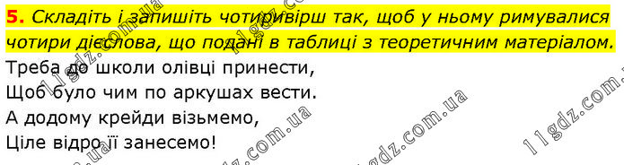Складіть і запишіть чотиривірш так, щоб у ньому римувалися чотири дієслова, що подані в таблиці з теоретичним матеріалом. Треба до школи олівці принести, Щоб було чим по аркушах вести. А додому крейди візьмемо, Ціле відро її занесемо!