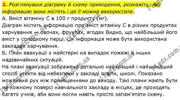 Розглянувши діаграму й схему приміщення, розкажіть, яку інформацію вони містять і де її можна використати. А. Вміст вітаміну С в 100 г продукту (мг). Діаграм містить інформацію про зміст вітаміну С в різних продуктах харчування — овочах, фруктах, ягодах Видно, що найбільший його вміст у солодкому перці. Ця інформація може бути використана закладах харчування. Б. План евакуації з майстерні на випадок пожежі й інших надзвичайних ситуацій. На плані евакуації зображено детально найкращий і найшвидший спосіб утекти від небезпеки у закладі освіти, школі. Показано можливий рух між приміщеннями до виходу. Такі плани мають бути на кожному поверсі навчального закладу в місцях, де проходять багато учнів, аби вони могли навіть просто запам'ятати схему.