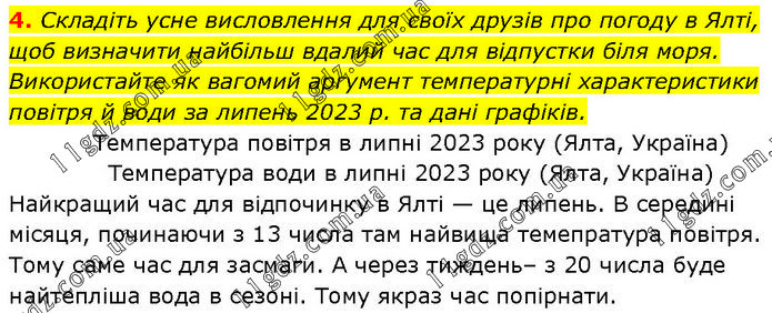 Складіть усне висловлення для своїх друзів про погоду в Ялті, щоб визначити найбільш вдалий час для відпустки біля моря. Використайте як вагомий аргумент температурні характеристики повітря й води за липень 2023 р. та дані графіків. Температура повітря в липні 2023 року (Ялта, Україна) Температура води в липні 2023 року (Ялта, Україна) Найкращий час для відпочинку в Ялті — це липень. В середині місяця, починаючи з 13 числа там найвища темепратура повітря. Тому саме час для засмаги. А через тиждень– з 20 числа буде найтепліша вода в сезоні. Тому якраз час попірнати.