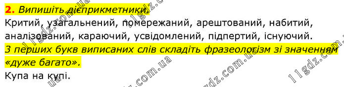 Випишіть дієприкметники. Критий, узагальнений, помережаний, арештований, набитий, аналізований, караючий, усвідомлений, підпертий, існуючий. 3 перших букв виписаних слів складіть фразеологізм зі значенням «дуже багато». Купа на купі.
