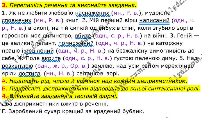 3. Перепишіть речення та виконайте завдання. 1. Як не любити любов’ю наснажених (мн., Р. в.), мудрістю сповнених (мн., Р. в.) книг! 2. Мій перший вірш написаний (одн., ч. р., Н. в.) в окопі, на тій сипкій од вибухів стіні, коли згубило зорі в гороскопі моє дитинство, вбите (одн., с. р., Н. в.) на війні. 3. Геній — це великий талант, помножений (одн., ч. р., Н. в.) на каторжну працю і поділений (одн., ч. р., Н. в.) на безжалісну вимогливість до себе. 4. Поле вкрите (одн., с. р., Н. в.) густою пеленою диму. 5. Над розквітлою (одн., ж. р., Ор. в.) землею, над усім світом мерехтливо яріли достиглі (мн., Н. в.) світанкові зорі. А. Надпишіть рід, число й відмінок над кожним дієприкметником. Б. Підкресліть дієприкметники відповідно до їхньої синтаксичної ролі. 4. Виконайте завдання в тестовій формі. Два дієприкметники вжито в реченні. Г. Зароблений сухар кращий за крадений бублик.