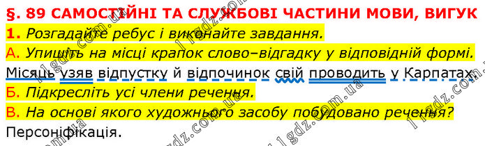 §. 89 САМОСТІЙНІ ТА СЛУЖБОВІ ЧАСТИНИ МОВИ, ВИГУК 1. Розгадайте ребус і виконайте завдання. А. Упишіть на місці крапок слово–відгадку у відповідній формі. Місяць узяв відпустку й відпочинок свій проводить у Карпатах. Б. Підкресліть усі члени речення. В. На основі якого художнього засобу побудовано речення? Персоніфікація.