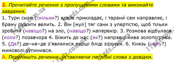 Прочитайте речення з пропущеними словами та виконайте завдання. 1. Турн сили (скільки?) вдвоє прикладає, і тарани́ сам направляє, і браму рушити велить. 2. Він [мул] тяг сани з упертістю, щоб тільки зробити (навіщо?) на зло, (навіщо?) наперекір. 3. Розмова відбулася (коли?) позавчора 4. Біжить до нас (як?) направці нива золотогрива. 5. (Де?) де–не–де з’являлися перші бліді зірочки. 6. Князь (чому?) мимоволі зупинився. А. Перепишіть речення, уставляючи потрібні слова з довідки.