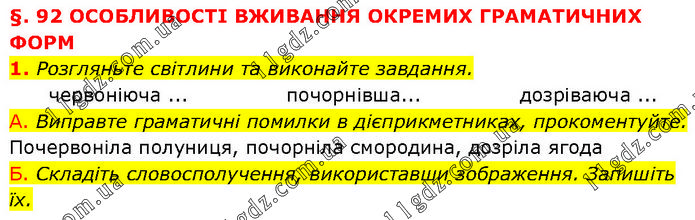 §. 92 ОСОБЛИВОСТІ ВЖИВАННЯ ОКРЕМИХ ГРАМАТИЧНИХ ФОРМ 1. Розгляньте світлини та виконайте завдання. червоніюча ... почорнівша... дозріваюча ... А. Виправте граматичні помилки в дієприкметниках, прокоментуйте. Почервоніла полуниця, почорніла смородина, дозріла ягода. Б. Складіть словосполучення, використавши зображення. Запишіть їх.