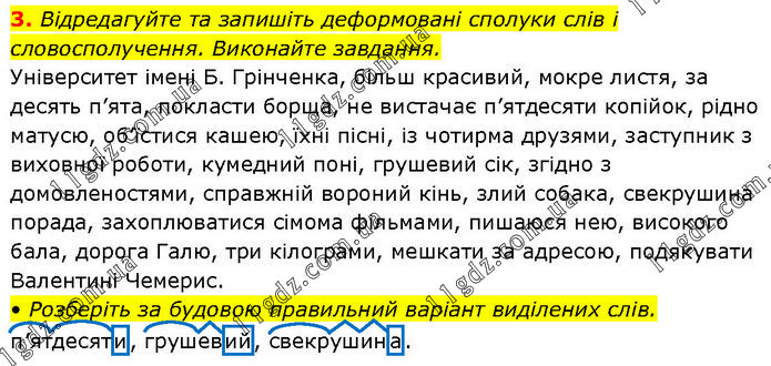 Відредагуйте та запишіть деформовані сполуки слів і словосполучення. Виконайте завдання. Університет імені Б. Грінченка, більш красивий, мокре листя, за десять п’ята, покласти борща, не вистачає п’ятдесяти копійок, рідно матусю, об’їстися кашею, їхні пісні, із чотирма друзями, заступник з виховної роботи, кумедний поні, грушевий сік, згідно з домовленостями, справжній вороний кінь, злий собака, свекрушина порада, захоплюватися сімома фільмами, пишаюся нею, високого бала, дорога Галю, три кілограми, мешкати за адресою, подякувати Валентині Чемерис. • Розберіть за будовою правильний варіант виділених слів. п’ятдесяти, грушевий, свекрушина.