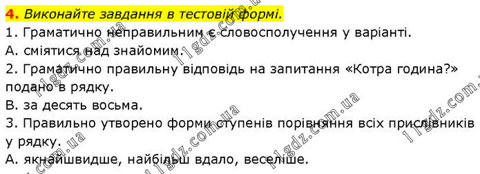 Виконайте завдання в тестовій формі. 1. Граматично неправильним є словосполучення у варіанті. А. сміятися над знайомим. 2. Граматично правильну відповідь на запитання «Котра година?» подано в рядку. В. за десять восьма. 3. Правильно утворено форми ступенів порівняння всіх прислівників у рядку. А. якнайшвидше, найбільш вдало, веселіше.
