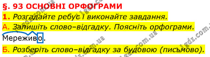 §. 93 ОСНОВНІ ОРФОГРАМИ 1. Розгадайте ребус і виконайте завдання. А. Запишіть слово–відгадку. Поясніть орфограми. Мереживо. Б. Розберіть слово–відгадку за будовою (письмово).
