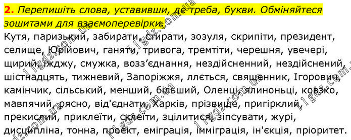 Перепишіть слова, уставивши, де треба, букви. Обміняйтеся зошитами для взаємоперевірки. Кутя, паризький, забирати, стирати, зозуля, скрипіти, президент, селище, Юрійович, ганяти, тривога, тремтіти, черешня, увечері, щирий, їжджу, смужка, возз’єднання, нездійсненний, нездійснений, шістнадцять, тижневий, Запоріжжя, ллється, священник, Ігорович, камінчик, сільський, менший, більший, Оленці, ялиноньці, ковзко, мавпячий, рясно, від'єднати, Харків, прізвище, пригірклий, прекислий, приклеїти, склеїти, зцілитися, зіпсувати, журі, дисципліна, тонна, проект, еміграція, імміграція, ін'єкція, пріоритет.