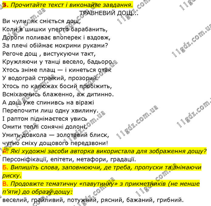 Прочитайте текст і виконайте завдання. ТРАВНЕВИЙ ДОЩ... Ви чули, як сміється дощ, Коли в шишки уперто барабанить, Дороги поливає впоперек і вздовж, За плечі обіймає мокрими руками? Регоче дощ , вистукуючи такт, Кружляючи у танці весело, бадьоро. Хтось зніме плащ — і кинеться отак У водограй стрімкий, прозорий. Хтось по калюжах босий пробіжить, Всміхаючись блаженно, аж дитинно. А дощ уже спинивсь на віражі Перепочити лиш одну хвилину. І раптом піднімаєтеся увись Омити теплі сонячні долоні. Умить довкола — золотавий блиск, чутно сміху дощового передзвони! A. Які художні засоби авторка використала для зображення дощу? Персоніфікації, епітети, метафори, градації. Б. Випишіть слова, заповнюючи, де треба, пропуски та знімаючи риску. B. Продовжте тематичну «павутинку» з прикметників (не менше п’яти) до образу дощу: веселий, грайливий, потужний, рясний, бажаний, грибний.