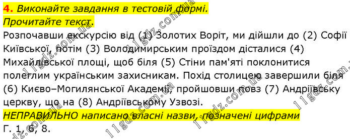 Виконайте завдання в тестовій формі. Прочитайте текст. Розпочавши екскурсію від (1) Золотих Воріт, ми дійшли до (2) Софії Київської, потім (3) Володимирським проїздом дісталися (4) Михайлівської площі, щоб біля (5) Стіни пам'яті поклонитися полеглим українським захисникам. Похід столицею завершили біля (6) Києво–Могилянської Академії, пройшовши повз (7) Андріївську церкву, що на (8) Андріївському Узвозі. НЕПРАВИЛЬНО написано власні назви, позначені цифрами Г. 1, 6, 8.