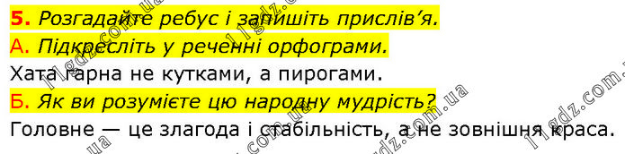 Розгадайте ребус і запишіть прислів’я. А. Підкресліть у реченні орфограми. Хата гарна не кутками, а пирогами. Б. Як ви розумієте цю народну мудрість? Головне — це злагода і стабільність, а не зовнішня краса.
