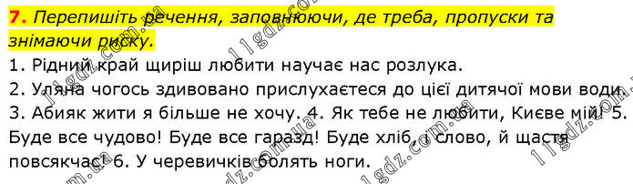 Перепишіть речення, заповнюючи, де треба, пропуски та знімаючи риску. 1. Рідний край щиріш любити научає нас розлука. 2. Уляна чогось здивовано прислухаєтеся до цієї дитячої мови води. 3. Абияк жити я більше не хочу. 4. Як тебе не любити, Києве мій! 5. Буде все чудово! Буде все гаразд! Буде хліб, і слово, й щастя повсякчас! 6. У черевичків болять ноги.