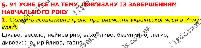 §. 94 УСНЕ ЕСЕ НА ТЕМУ, ПОВ’ЯЗАНУ ІЗ ЗАВЕРШЕННЯМ НАВЧАЛЬНОГО РОКУ 1. Складіть асоціативне гроно про вивчення української мови в 7–му класі. Цікаво, весело, неймовірно, захопливо, безупинно, легко, дивовижно, мрійливо, гарно.