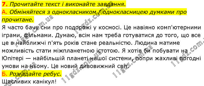 Прочитайте текст і виконайте завдання. А. Обміняйтеся з однокласником / однокласницею думками про прочитане. Я часто бачу сни про подорожі у космосі. Це навіяно комп'ютерними іграми, фільмами. Думаю, всім нам треба готуватися до того, що все це в найближчі п'ять років стане реальністю. Людина матиме можливість стати міжпланетною істотою. Я хотів би побувати на Юпітері — найбільшій планеті нашої системи, попри жахливі погодні умови на ньому. Це новий дивовижний світ. Б. Розгадайте ребус. Щасливих канікул!
