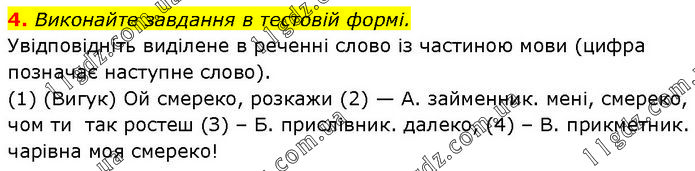 Виконайте завдання в тестовій формі. Увідповідніть виділене в реченні слово із частиною мови (цифра позначає наступне слово). (1) (Вигук) Ой смереко, розкажи (2) — А. займенник. мені, смереко, чом ти так ростеш (З) – Б. прислівник. далеко, (4) – В. прикметник. чарівна моя смереко!