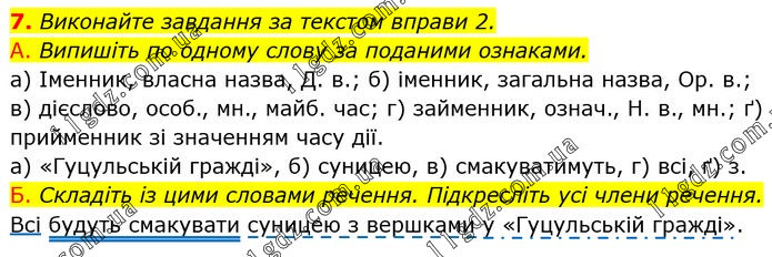 Виконайте завдання за текстом вправи 2. А. Випишіть по одному слову за поданими ознаками. а) Іменник, власна назва, Д. в.; б) іменник, загальна назва, Ор. в.; в) дієслово, особ., мн., майб. час; г) займенник, означ., Н. в., мн.; ґ) прийменник зі значенням часу дії. а) «Гуцульській гражді», б) суницею, в) смакуватимуть, г) всі, ґ) з. Б. Складіть із цими словами речення. Підкресліть усі члени речення. Всі будуть смакувати суницею з вершками у «Гуцульській гражді».