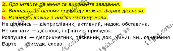 Прочитайте речення та виконайте завдання. А. Випишіть по одному прикладу кожної форми дієслова. Б. Розберіть кожну з них як частину мови. Не цілячись — дієприслівник, активний, недок. обставина. Не вигнати — дієслово, інфінітив, присудок. Розпущені — дієприкметник, пасивний, док. Мин. ч. мн., означення Варте — присудк. слово.