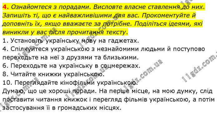 Ознайомтеся з порадами. Висловте власне ставлення до них. Запишіть ті, що є найважливішими для вас. Прокоментуйте й доповніть їх, якщо вважаєте за потрібне. Поділіться ідеями, які виникли у вас після прочитання тексту. 1. Установіть українську мову на гаджетах. 4. Спілкуйтеся українською з незнайомими людьми й поступово переходьте на неї з друзями та близькими. 6. Переходьте на українську в соцмережах. 8. Читайте книжки українською. 10. Переглядайте кінофільми українською. Думаю, що це хороші поради. На перше місце, на мою думку, слід поставити читання книжок і перегляд фільмів українською, а потім застосування її в громадських місцях.