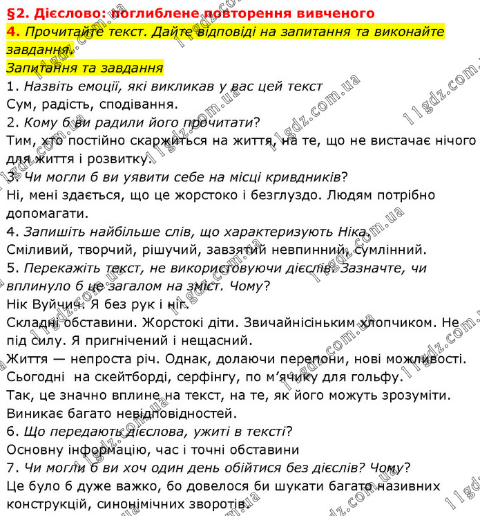 §2. Дієслово: поглиблене повторення вивченого 4. Прочитайте текст. Дайте відповіді на запитання та виконайте завдання. Запитання та завдання 1. Назвіть емоції, які викликав у вас цей текст Сум, радість, сподівання. 2. Кому б ви радили його прочитати? Тим, хто постійно скаржиться на життя, на те, що не вистачає нічого для життя і розвитку. 3. Чи могли б ви уявити себе на місці кривдників? Ні, мені здається, що це жорстоко і безглуздо. Людям потрібно допомагати. 4. Запишіть найбільше слів, що характеризують Ніка. Сміливий, творчий, рішучий, завзятий невпинний, сумлінний. 5. Перекажіть текст, не використовуючи дієслів. Зазначте, чи вплинуло б це загалом на зміст. Чому? Нік Вуйчич. Я без рук і ніг. Складні обставини. Жорстокі діти. Звичайнісіньким хлопчиком. Не під силу. Я пригнічений і нещасний. Життя — непроста річ. Однак, долаючи перепони, нові можливості. Сьогодні на скейтборді, серфінгу, по м’ячику для гольфу. Так, це значно вплине на текст, на те, як його можуть зрозуміти. Виникає багато невідповідностей. 6. Що передають дієслова, ужиті в тексті? Основну інформацію, час і точні обставини 7. Чи могли б ви хоч один день обійтися без дієслів? Чому? Це було б дуже важко, бо довелося би шукати багато називних конструкцій, синонімічних зворотів.