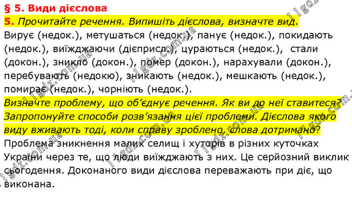 § 5. Види дієслова 5. Прочитайте речення. Випишіть дієслова, визначте вид. Вирує (недок.), метушаться (недок.), панує (недок.), покидають (недок.), виїжджаючи (дієприсл.), цураються (недок.), стали (докон.), зникло (докон.), помер (докон.), нарахували (докон.), перебувають (недокю), зникають (недок.), мешкають (недок.), помирає (недок.), чорніють (недок.). Визначте проблему, що об’єднує речення. Як ви до неї ставитеся? Запропонуйте способи розв’язання цієї проблеми. Дієслова якого виду вживають тоді, коли справу зроблено, слова дотримано? Проблема зникнення малих селищ і хуторів в різних куточках України через те, що люди виїжджають з них. Це серйозний виклик сьогодення. Доконаного види дієслова переважають при діє, що виконана.