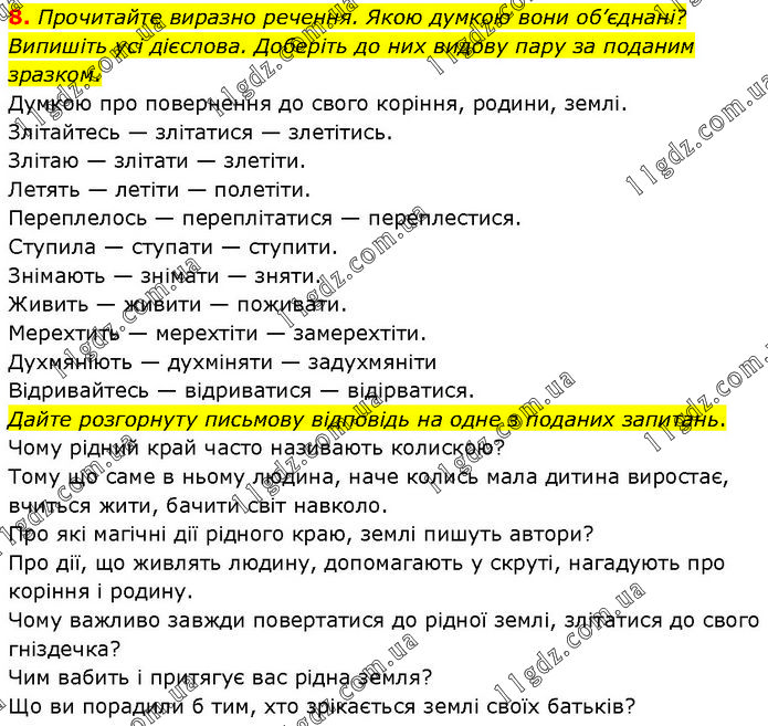 Прочитайте виразно речення. Якою думкою вони об’єднані? Випишіть усі дієслова. Доберіть до них видову пару за поданим зразком. Думкою про повернення до свого коріння, родини, землі. Злітайтесь — злітатися — злетітись. Злітаю — злітати — злетіти. Летять — летіти — полетіти. Переплелось — переплітатися — переплестися. Ступила — ступати — ступити. Знімають — знімати — зняти. Живить — живити — поживати. Мерехтить — мерехтіти — замерехтіти. Духмяніють — духміняти — задухмяніти Відривайтесь — відриватися — відірватися. Дайте розгорнуту письмову відповідь на одне з поданих запитань. Чому рідний край часто називають колискою? Тому що саме в ньому людина, наче колись мала дитина виростає, вчиться жити, бачити світ навколо. Про які магічні дії рідного краю, землі пишуть автори? Про дії, що живлять людину, допомагають у скруті, нагадують про коріння і родину. Чому важливо завжди повертатися до рідної землі, злітатися до свого гніздечка? Чим вабить і притягує вас рідна земля? Що ви порадили б тим, хто зрікається землі своїх батьків?