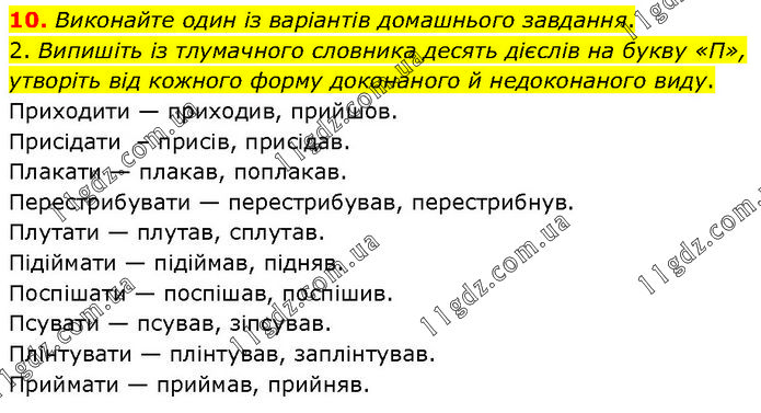 Виконайте один із варіантів домашнього завдання. 2. Випишіть із тлумачного словника десять дієслів на букву «П», утворіть від кожного форму доконаного й недоконаного виду. Приходити — приходив, прийшов. Присідати – присів, присідав. Плакати — плакав, поплакав. Перестрибувати — перестрибував, перестрибнув. Плутати — плутав, сплутав. Підіймати — підіймав, підняв. Поспішати — поспішав, поспішив. Псувати — псував, зіпсував. Плінтувати — плінтував, заплінтував. Приймати — приймав, прийняв.