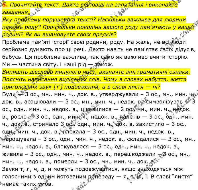 Прочитайте текст. Дайте відповіді на запитання і виконайте завдання. Яку проблему порушено в тексті? Наскільки важлива для людини пам’ять роду? Про скільки поколінь вашого роду пам’ятають у вашій родині? Як ви вшановуєте своїх предків? Проблема пам'яті історії своєї родини, роду. На жаль, не всі люди серйозно думають про ці речі. Дехто навіть не пам'ятає своїх дідусів, бабусь. Ця проблема важлива, так само як важливо вчити історію. Ми — частина світу, і наші рід — також. Випишіть дієслова минулого часу, визначте їхні граматичні ознаки. Поясніть написання виділених слів. Чому в словах набуття, життя приголосний звук [т'] подовжений, а в слові листя — ні? Були — 3 ос., мн., мин. ч., док. в., утверджували – 3 ос., мн., мин. ч., док. в., асоціювали — 3 ос., мн., мин. ч., недок. в., символізував — 3 ос., одн., мин. ч., недок. в., цікавилися — 2 ос., мн., мин. ч., недок. в., росло — 3 ос., одн., мин. ч., недок. в., налетів — 3 ос., одн., мин. ч., док. в., стримало 3 ос., одн., мин. ч., док. в, захистило – 3 ос., одн., мин. ч., док. в., плекала – 3 ос., одн., мин. ч., недок. в., нарощувала – 3 ос., одн., мин. ч., недок. в., складалися — 3 ос., мн., мин. ч., недок. в., блокувалося — 3 ос., одн., мин. ч., недок. в., живила – 3 ос., одн., мин. ч., недок. в., перешкоджали – 3 ос., мн., мин. ч., недок. в., померли – 3 ос., мн., мин. ч., док. в. Звуки т, л, ч, д, н можуть подовжуватися, якщо знаходяться між голосними з одним йотованим попереду — я, є, ю, ї. В слові “листя” немає таких умов.